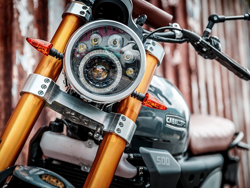 La Caballero Deluxe 500 está construida con las mismas especificaciones técnicas que la 500 Scrambler, pero con un nuevo aspecto y preciosos detalles como el manillar con travesaño, un moderno depósito de combustible gris y guardabarros, para contrastar con el cuero marrón.